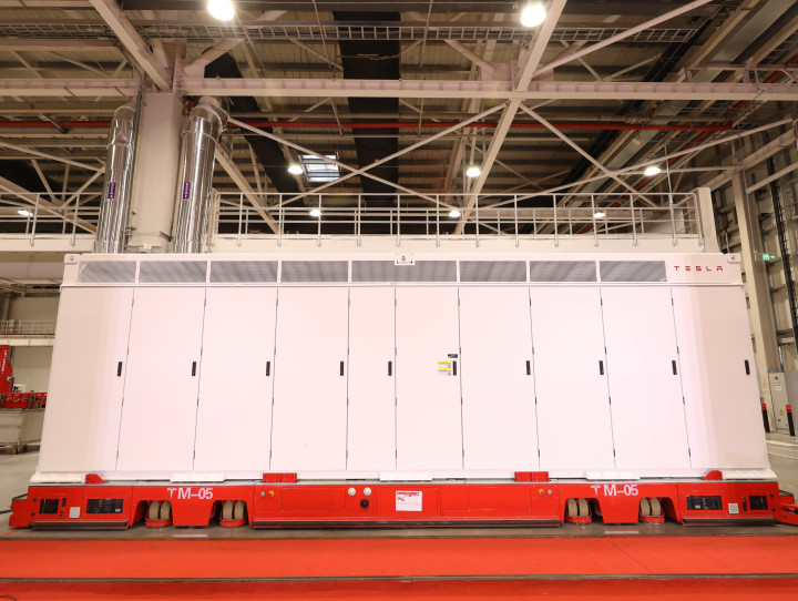 这是2月11日在特斯拉上海储能超级工厂投产仪式现场拍摄的超大型电化学商用储能系统。(新华社)